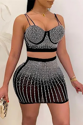 Black Fashion Sexy Patchwork Hot Drilling See-through Backless Spaghetti Strap Sleeveless Two Pieces